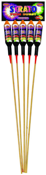 The Strato Twin Burst Rocket Pack is designed for those who want to take their fireworks display to new heights. This pack includes five powerful rockets, each engineered to soar high into the sky and unleash spectacular twin bursts of color. With vibrant hues and stunning visual effects, these rockets create a captivating aerial spectacle that will leave your audience in awe.